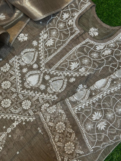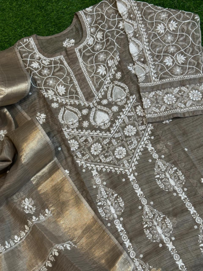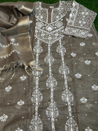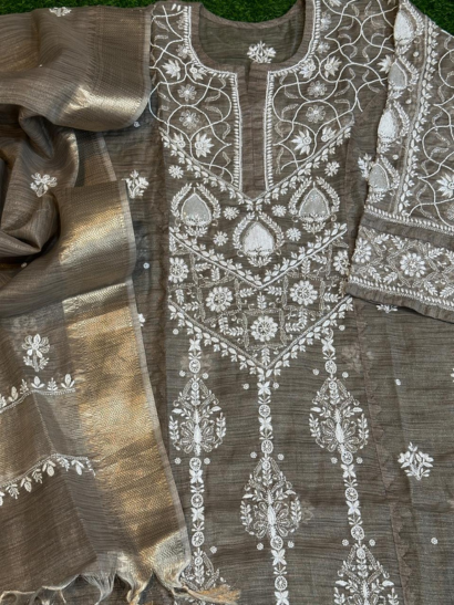 Pure colored tissue Chikankari semi-stitched kurta and dupatta set with beautiful embellishments